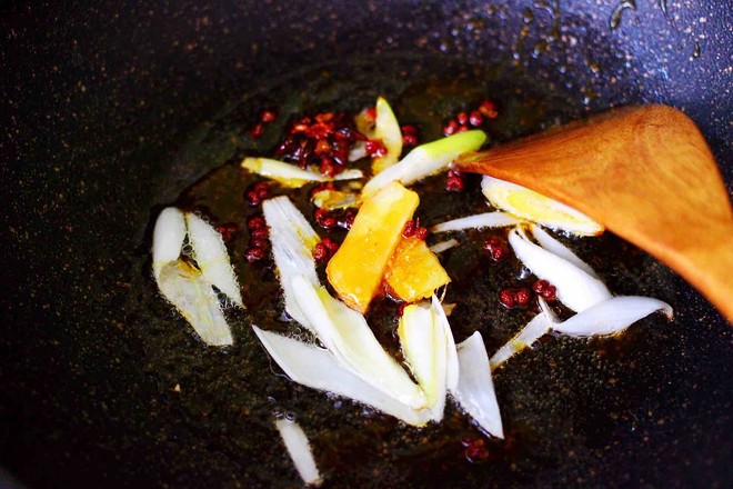 8.這個(gè)時(shí)候加入花椒和八角,小火慢慢炸出香味后,再爆香蔥姜片。