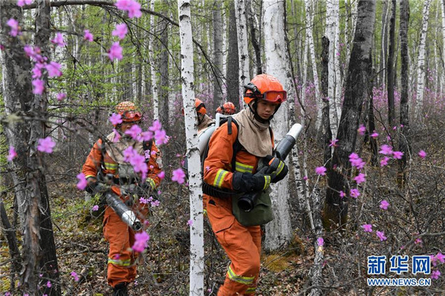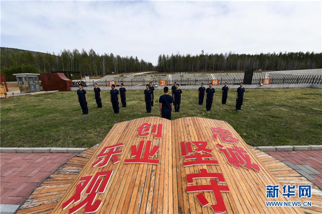 這是內(nèi)蒙古森林消防總隊(duì)大興安嶺支隊(duì)奇乾中隊(duì)的營(yíng)地,營(yíng)地后山上的“忠誠(chéng)”二字是用白樺樹(shù)樹(shù)干拼接而成(5月15日攝)。新華社記者 劉磊 攝