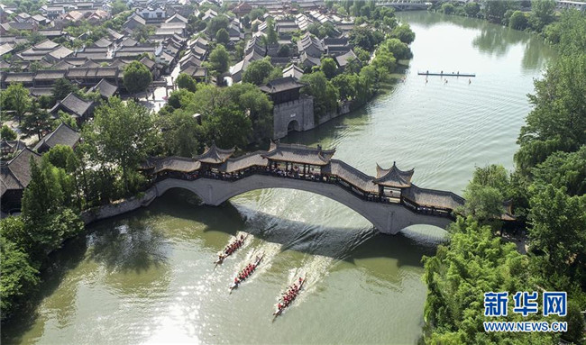 人們在山東省棗莊市臺兒莊古城古運河道上劃龍舟(2019年6月7日無人機(jī)拍攝)。 新華社發(fā)(高啟民 攝)