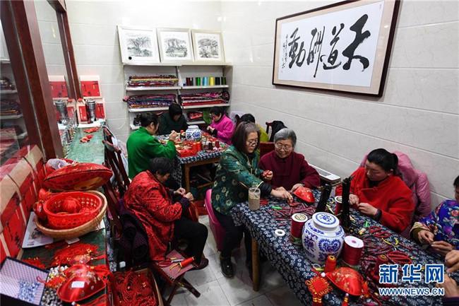 在江蘇省徐州市潘安湖國家濕地公園內(nèi)的香包工作室,王秀英老人與村民們一起制作香包(2018年1月17日攝)。新華社記者 季春鵬 攝