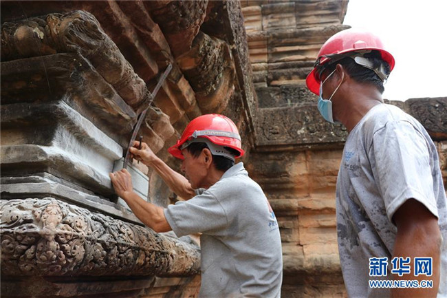 在柬埔寨暹粒,中國——柬埔寨政府吳哥古跡保護(hù)工作隊進(jìn)行茶膠寺保護(hù)修復(fù)項目的結(jié)項收尾工作(2018年7月9日攝)。新華社記者 毛鵬飛 攝