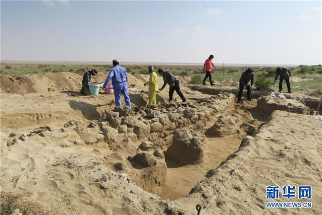 中國—沙特阿拉伯聯(lián)合考古隊隊員在沙特塞林港遺址現(xiàn)場工作(2019年1月12日攝)。新華社發(fā)(王霽攝)