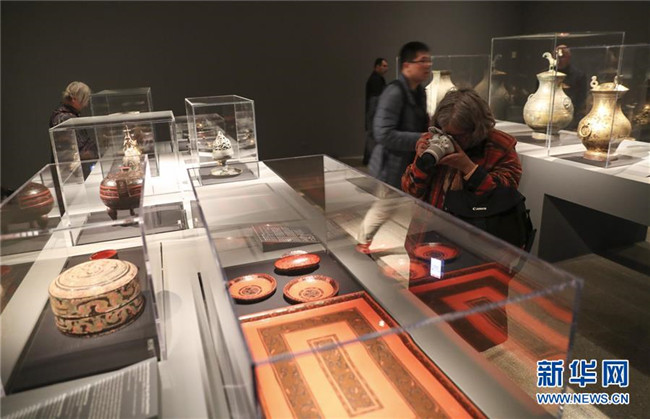 在美國紐約大都會博物館,參觀者在大型展覽“秦漢文明”媒體預(yù)展上拍攝展品(2017年3月27日攝)。