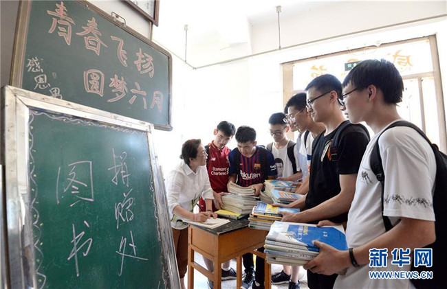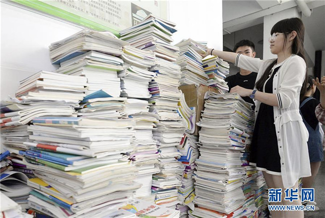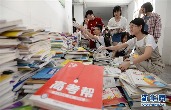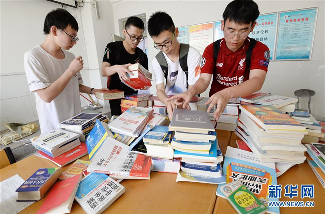 6月9日,在河北省邯鄲市第一中學(xué),高三畢業(yè)生整理同學(xué)們捐贈(zèng)的書籍。