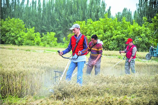 6月13日,新疆洛浦縣衛(wèi)生健康委員會駐該縣多魯鄉(xiāng)墩阿孜瑪村“訪惠聚”工作隊,帶領(lǐng)志愿者服務(wù)隊幫助村民收割小麥。 據(jù)了解,洛浦縣今年小麥種植面積18萬畝,截至目前已收割7萬余畝。買買提艾力·艾尼瓦爾 攝