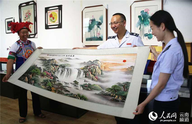 沉下心來學(xué)習(xí)刺繡的王陸芬朝著自己的小目標(biāo)努力。白天,她向村里的老人們學(xué)習(xí)刺繡技法,學(xué)習(xí)構(gòu)圖、畫圖,晚上就在家里刻苦練習(xí)。一有機會,王陸芬就出去考察學(xué)習(xí)。“有一年去上海考察,看到他們的刺繡還沒有我做的精細(xì),沒想到價格還很貴。”這讓王陸芬堅定了自己的想法,在王陸芬的帶動下,白沙坡村成立了刺繡協(xié)會,協(xié)會一開始只有26人。2014年2月,技藝日臻成熟的王陸芬成立了“紙藝刺繡農(nóng)民專業(yè)合作社”,2015年成立硯山縣華韻手工刺繡有限公司。