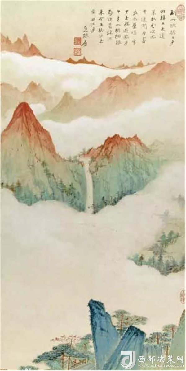 《華山云?!愤@幅山水畫是由中國著名山水畫家張大千先生創(chuàng)作,該幅山水畫作品圖也是畫家作品當中出類撥萃的的精品之一,描繪了華山旭日東升的云海。