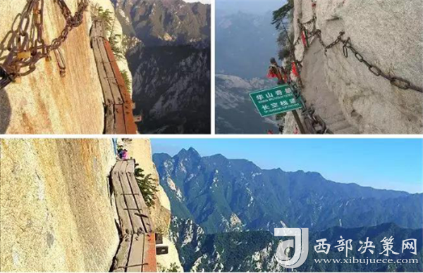 華山著名景區(qū)多達(dá)210余處,有凌空架設(shè)的長空棧道,三面臨空的鷂子翻身,以及在峭壁絕崖上鑿出的千尺幢、百尺峽、老君犁溝等,其中華岳仙掌被列為關(guān)中八景之首。