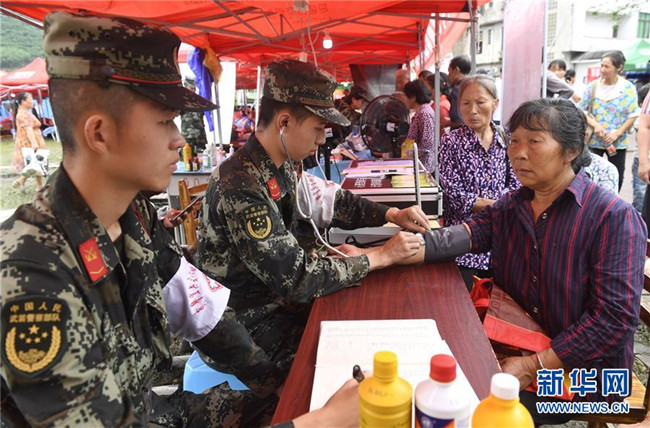 在四川長寧地震災區(qū)安置點,武警宜賓支隊衛(wèi)生隊黨小組成員為群眾提供醫(yī)療服務(6月20日攝)。新華社記者 劉坤 攝