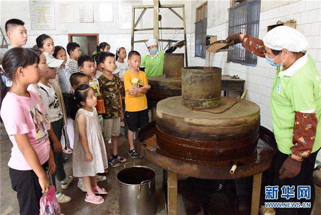 7月2日,安徽省銅陵市大通鎮(zhèn)中心學(xué)校學(xué)生在暑期社會實踐活動中參觀大通小磨麻油制作過程。 新華社發(fā)(過仕寧 攝)