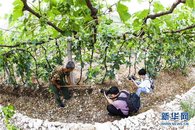7月2日,河北傳媒學(xué)院的學(xué)生在河北遵化市新店子鎮(zhèn)沙石峪村葡萄園里采訪拍照。 新華社發(fā)(劉滿倉 攝)