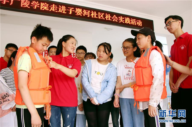 7月2日,揚州大學(xué)廣陵學(xué)院大學(xué)生志愿者為寶應(yīng)縣子嬰河社區(qū)留守兒童講解救生衣的使用方法。新華社發(fā)(沈冬兵 攝)