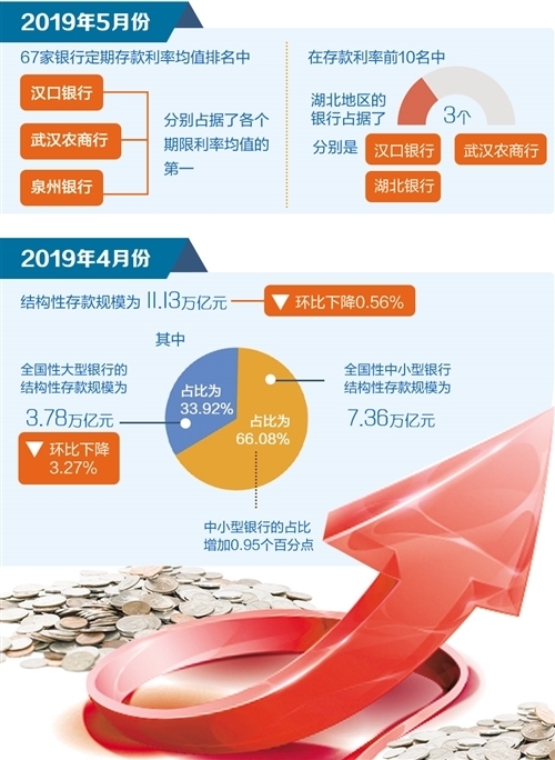 據(jù)央行數(shù)據(jù)顯示,2019年4月份結(jié)構(gòu)性存款規(guī)模為11.13萬億元,環(huán)比下降0.56%。其中,全國(guó)性大型銀行結(jié)構(gòu)性存款規(guī)模為3.78萬億元,環(huán)比下降3.27%,占比為33.92%;全國(guó)性中小型銀行結(jié)構(gòu)性存款規(guī)模為7.36萬億元,占比為66.08%,中小型銀行占比增加0.95個(gè)百分點(diǎn)。