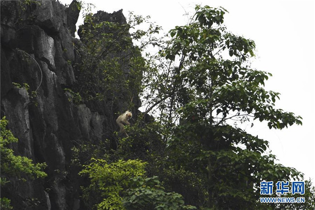 當日,記者在廣西恩城國家級自然保護區(qū)邊緣的大新縣桃城鎮(zhèn)寶新村城南小學后山上拍攝到一只白化黑葉猴幼體。