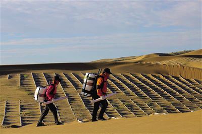 “沙袋內(nèi)只需充填干沙,平鋪于沙表面即完成了聚乳酸沙袋沙障的鋪設。同草方格等傳統(tǒng)沙障相比較,其鋪設效率可提高3至5倍、材料搬運量降低20至60倍。障體材料輕便,真正實現(xiàn)了‘以沙治沙’的科學理念。”虞毅說。