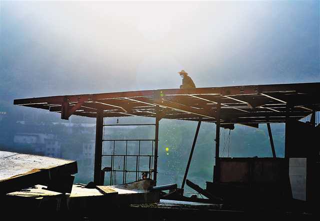 在嘉陵江北碚區(qū)段,工人在拆解餐飲船。特約攝影 秦廷富