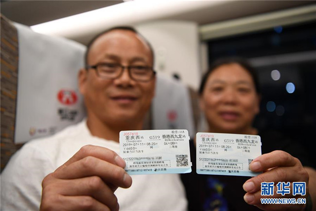 7月11日,乘坐G319次列車的乘客展示前往香港的車票。當(dāng)日,重慶至香港直達(dá)高鐵正式開通,此次首發(fā)的G319次復(fù)興號(hào)列車運(yùn)行速度350km/h,沿途經(jīng)停遵義、貴陽東、桂林西、肇慶東、廣州南和深圳北站。列車由重慶西站至香港西九龍站全程運(yùn)行需7小時(shí)37分鐘,全程票二等座票價(jià)為660元。目前內(nèi)地與香港聯(lián)通的高鐵車站已增加到58個(gè)。新華社記者唐奕攝
