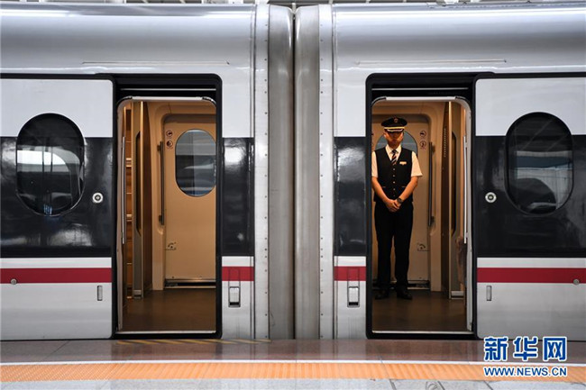 7月11日,一名鐵路工作人員在G319次列車旁工作。當(dāng)日,重慶至香港直達(dá)高鐵正式開通,此次首發(fā)的G319次復(fù)興號(hào)列車運(yùn)行速度350km/h,沿途經(jīng)停遵義、貴陽東、桂林西、肇慶東、廣州南和深圳北站。列車由重慶西站至香港西九龍站全程運(yùn)行需7小時(shí)37分鐘,全程票二等座票價(jià)為660元。目前內(nèi)地與香港聯(lián)通的高鐵車站已增加到58個(gè)。新華社記者唐奕攝
