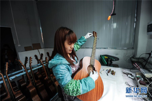 調(diào)音師在貴州省正安縣“正安·國(guó)際吉他產(chǎn)業(yè)園”為吉他校對(duì)音準(zhǔn)(2017年3月28日攝)。新華社記者 陶亮 攝