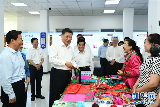 7月15日至16日,中共中央總書記、國家主席、中央軍委主席習(xí)近平在內(nèi)蒙古考察并指導(dǎo)開展“不忘初心、牢記使命”主題教育。這是15日上午,習(xí)近平在赤峰博物館同古典民族史詩《格薩(斯)爾》非物質(zhì)文化遺產(chǎn)傳承人親切交談。 新華社記者 謝環(huán)馳 攝