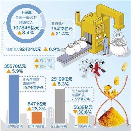 上半年,全國一般公共預(yù)算收入107846億元,同比增長3.4%。其中,全國稅收收入92424億元,同比增長0.9%。