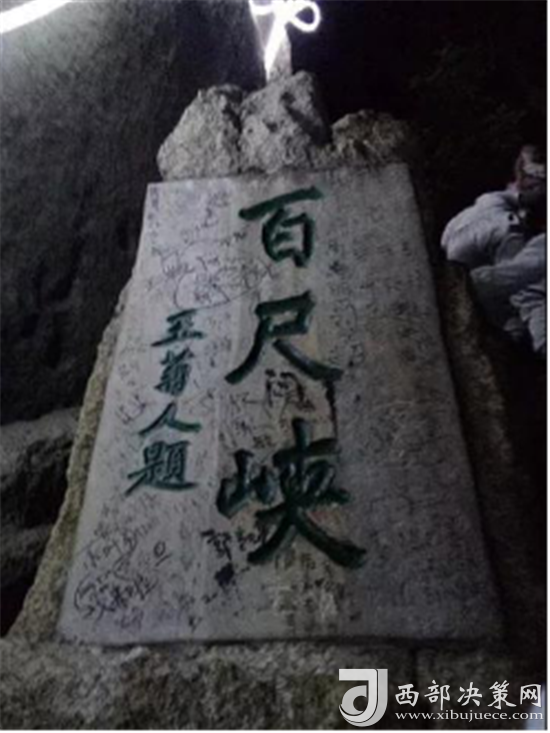 第一道險(xiǎn)關(guān)是千尺幢。未到千尺幢,先到“回心石”。游人走到這里,往前一看,到處是危崖峭壁,不覺(jué)望而生畏,有很多就不敢往前走了,“回心石”由此得名。