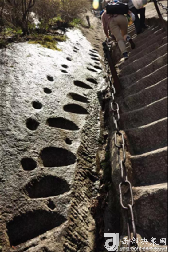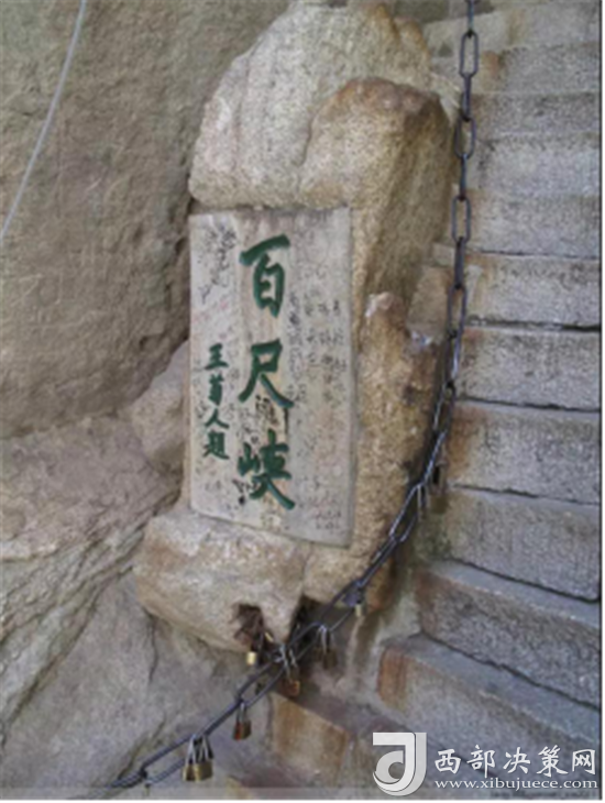 第二道險(xiǎn)關(guān)是百尺峽。這里兩壁高聳,中間夾著一塊從天而降的巨石,上刻“驚心石”三個(gè)大字,游人從石下小路穿過(guò),確實(shí)驚心動(dòng)魄。第三道險(xiǎn)關(guān)是老君犁溝,這是夾在陡峭石壁之間的一條溝狀險(xiǎn)道,有570多個(gè)石階。相傳這里原先根本沒(méi)有路,太上老君見了,就將手中的如意柄變成一張鐵犁, 又牽來(lái)青牛,一夜間犁成了這條山溝。傳說(shuō)青牛犁完溝后,見華山景色壯美,便化為石牛,永遠(yuǎn)地留在了華山之上。溝的盡頭是一道陡壁, 名為“猢猻愁”。顧名思義,連猴子都發(fā)愁,可見這里的山勢(shì)多么陡峭。