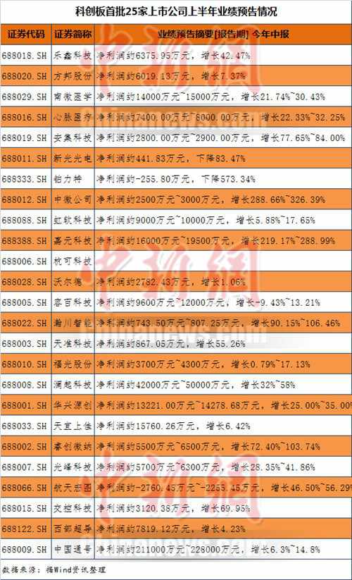 科創(chuàng)板首批25家上市公司上半年業(yè)績(jī)預(yù)告情況。制表:程春雨
