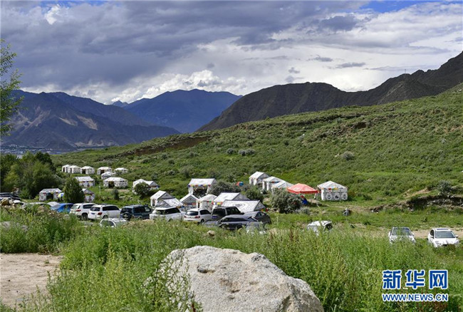 這是達(dá)東村景區(qū)的帳篷和旅游車(chē)輛(7月20日攝)。西藏拉薩市柳梧鄉(xiāng)達(dá)東村是一個(gè)千年古村,也曾是一個(gè)貧困村。近年來(lái),依托秀美的自然風(fēng)光、深厚的歷史文化和淳樸的風(fēng)土人情,當(dāng)?shù)卣畬?shí)施文化旅游產(chǎn)業(yè)精準(zhǔn)扶貧,使達(dá)東村蛻變成為鄉(xiāng)村旅游勝地。新華社記者張汝鋒攝