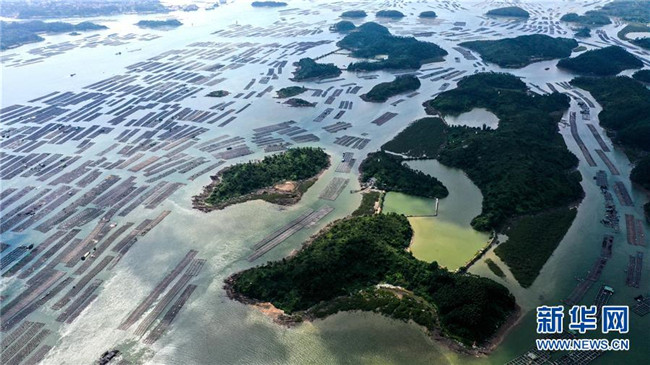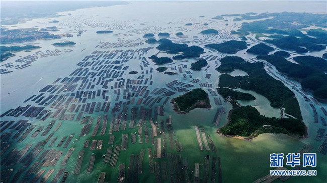 這是無(wú)人機(jī)拍攝的欽州市以七十二涇海域?yàn)橹行牡倪B片萬(wàn)畝大蠔養(yǎng)殖基地(7月20日攝)。 新華社記者 張愛(ài)林 攝