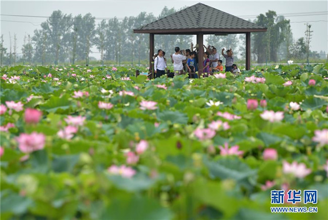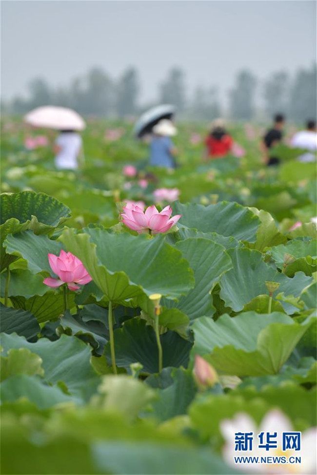 在江西省南昌市新建區(qū)聯(lián)圩鎮(zhèn),游客在當?shù)氐那М€荷花園觀賞游玩(7月20日攝)。新華社記者 彭昭之 攝
