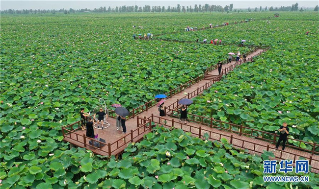 在江西省南昌市新建區(qū)聯(lián)圩鎮(zhèn),游客在當?shù)氐那М€荷花園觀賞游玩(7月20日無人機拍攝)。