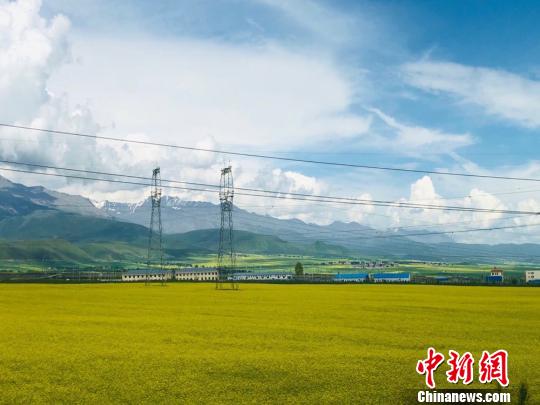 祁連山脈雪頂銀裝素裹,與油菜花交相輝映。 張婧 攝