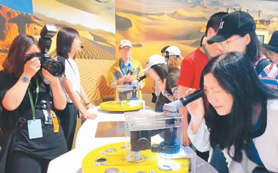 在內(nèi)蒙古恩格貝沙漠博物館(科學館),華文媒體代表用顯微鏡觀察沙粒。