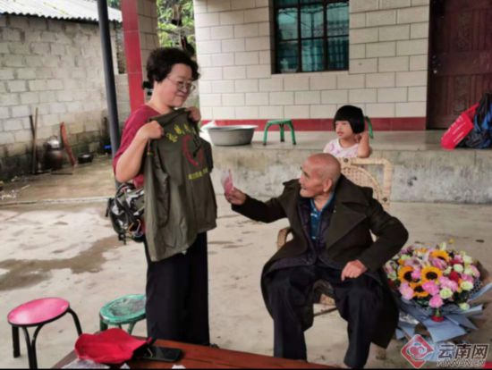 馬正群大姐(左)送給老人印有“抗戰(zhàn)老兵”字樣的馬褂
