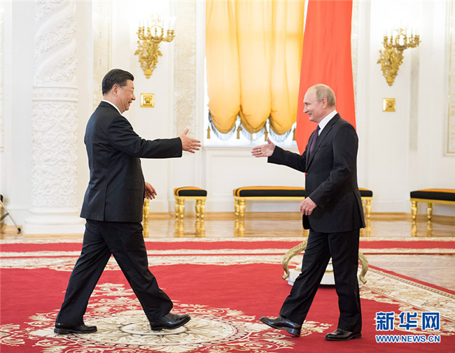 6月5日,克里姆林宮2層喬治大廳燈火通明。習(xí)近平主席和俄羅斯總統(tǒng)普京從數(shù)十米長的紅毯兩端相向走來。
