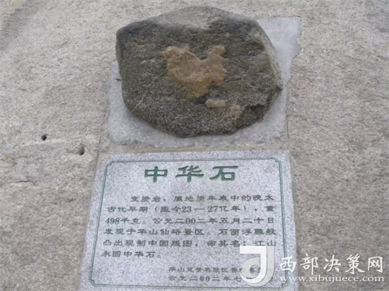 “中華石”于2002年5月20日在華山仙峪景區(qū)被發(fā)現(xiàn)。在淡墨色花崗巖石面上,浮雕般凸現(xiàn)出一塊白色石圖,此圖酷似現(xiàn)制中國版圖,十分形象通真。該石重約498千克,云母花崗巖石,大約形成于三千萬年前的白堊時期,現(xiàn)置北峰。(供稿:華旅集團(tuán)營銷中心)