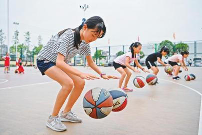 8月5日,南充小學生在操場上練習運球?! ”緢笥浾?楊樹 攝