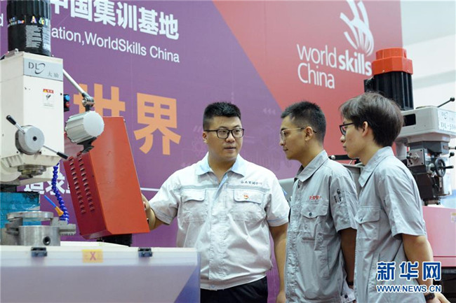 中國(guó)(天津)職業(yè)技能公共實(shí)訓(xùn)中心現(xiàn)代制造技術(shù)教研室主任王傳龍?jiān)谥笇?dǎo)學(xué)員實(shí)訓(xùn) (7月29日攝)。 新華社發(fā)