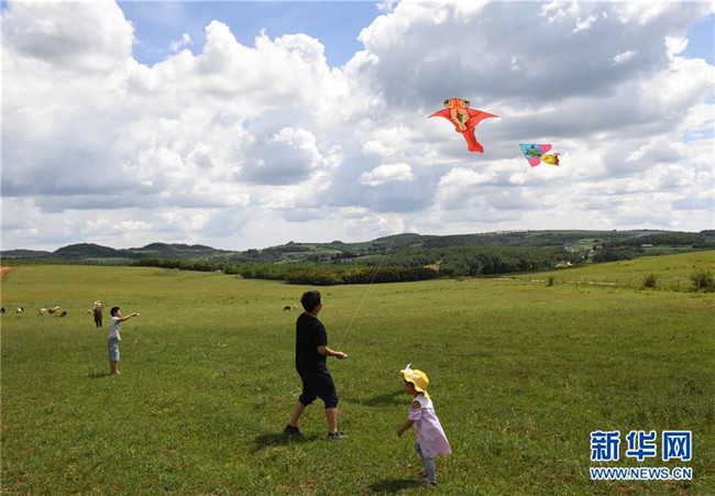 8月10日,游人在云南尋甸北大營草場(chǎng)放風(fēng)箏。 新華社記者楊宗友攝