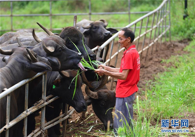 在廣西融安縣大良鎮(zhèn)古蘭村古蘭屯養(yǎng)?;兀?8歲的韋肇翠在喂牛(8月18日攝)。韋肇翠是養(yǎng)牛基地的飼養(yǎng)員,每個月有2800元的工資。 新華社記者 黃孝邦 攝