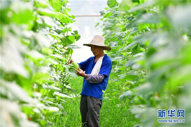 在廣西融安縣大良鎮(zhèn)古蘭村古蘭屯大棚基地,62歲的黃顯亮查看甜瓜生長情況(8月18日攝)。黃顯亮是大棚基地的技術員,每個月有3000多元的工資,已于2018年實現(xiàn)脫貧。 新華社記者 黃孝邦 攝