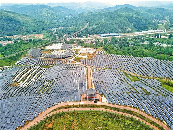 航拍商州區(qū)龍山光伏電站(6月30日)。該電站2018年9月建成,10月全部并網(wǎng)發(fā)電,年發(fā)電量3550萬度。龍山光伏電站的建成,可帶動全區(qū)1.8萬戶貧困戶戶均年增收3000元左右,成為新能源示范區(qū)和脫貧產(chǎn)業(yè)基地。(記者 田若楠攝)