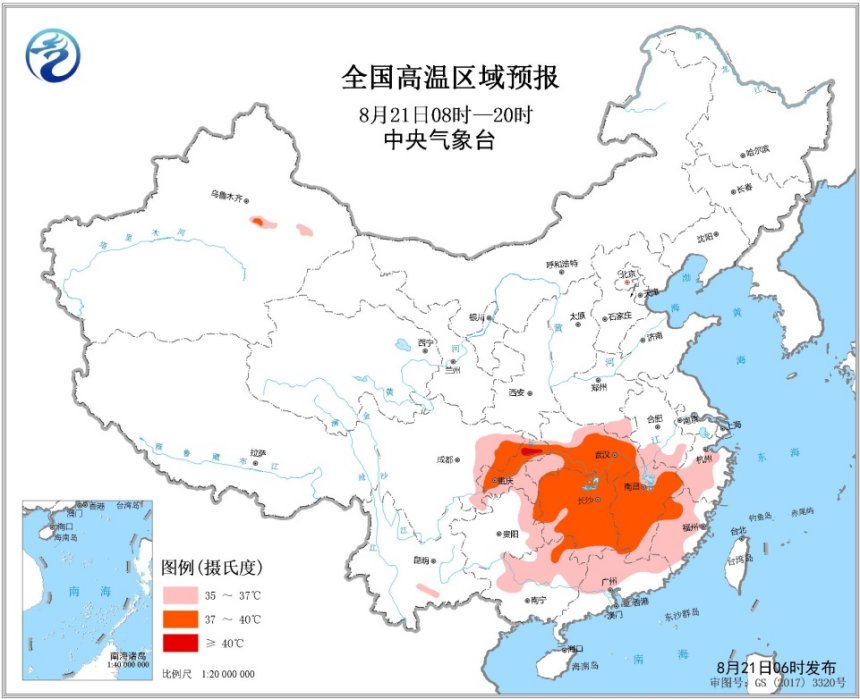 未來三天,西南地區(qū)東部、江漢、江南、華南中北部等地將有高溫天氣。中央氣象臺(tái)8月21日06時(shí)繼續(xù)發(fā)布高溫黃色預(yù)警。預(yù)計(jì)8月21日白天,江漢大部、江南大部、四川盆地東部、重慶、貴州東部、華南中北部等地最高氣溫35~36℃,其中,湖北中南部、湖南大部、江西大部、四川東北部、重慶大部、廣西東北部等地的部分地區(qū)最高氣溫37~39℃,重慶北部局地可達(dá)40℃以上。