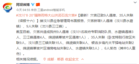 據(jù)阿壩州委外宣辦官方微博消息,接汶川縣應(yīng)急管理局書面報告,災(zāi)害新增1人遇難(汶川縣水磨鎮(zhèn))、9人失聯(lián)(汶川縣三江鎮(zhèn))。