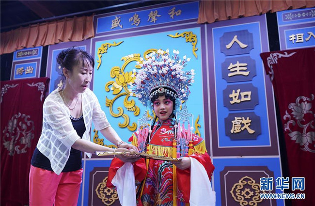 8月20日,河北省秦皇島市北戴河“裴艷玲藝術(shù)傳承基地”的老師在培訓(xùn)孩子們表演京劇。