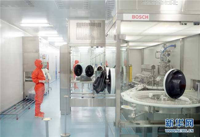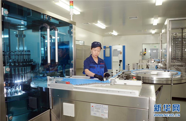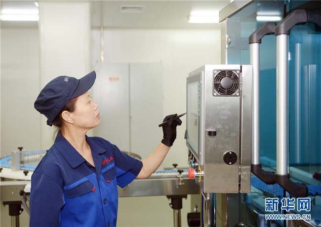 吉林敖東藥業(yè)集團(tuán)延吉股份有限公司燈檢線操作工朱秀芳在操作全自動(dòng)凍干粉針偵檢機(jī)(8月22日攝)。新華社發(fā)