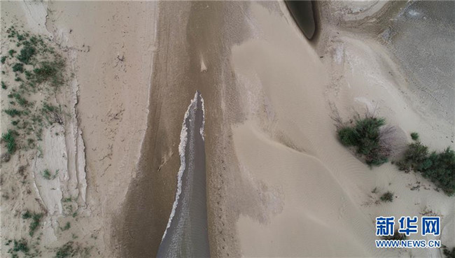 這是2019年實(shí)施的第20次向塔里木河下游生態(tài)輸水,水流在干涸的河床前行(8月25日無(wú)人機(jī)拍攝)。 新華社記者 阿曼 攝