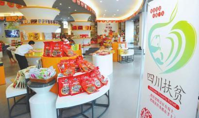在四川特產(chǎn)購(gòu)物中心內(nèi)售賣的貼有“四川扶貧”公益性集體商標(biāo)的產(chǎn)品。四川日?qǐng)?bào)記者何海洋攝