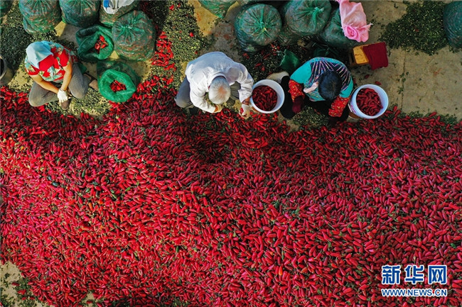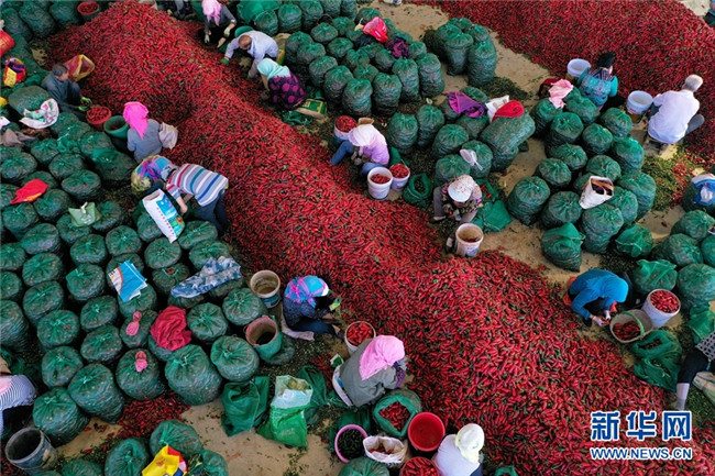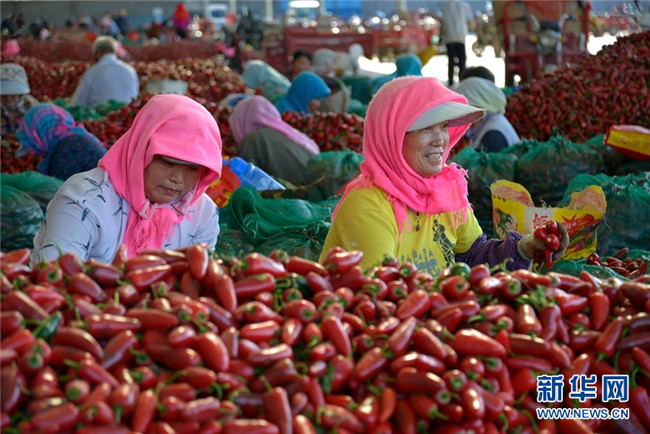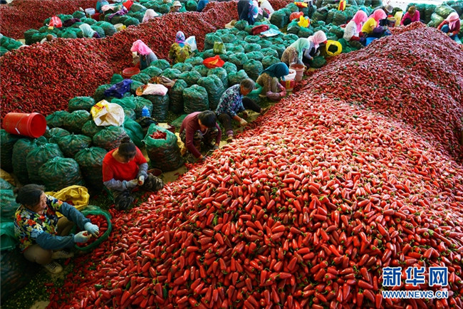這是近日在甘肅省高臺縣拍攝的辣椒分揀、挑選場景。時下,高臺縣宣化鎮(zhèn)和駱駝城鎮(zhèn)種植的1700畝墨西哥辣椒進(jìn)入采摘和收購期,火紅的辣椒堆積如山,映紅了農(nóng)民的笑臉。新華網(wǎng)發(fā)(鄭耀德 攝)